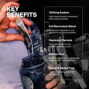 STYRKR SLT+ Berry & Lime is a high-strength electrolyte supplement engineered for endurance athletes facing heavy sweat loss, tough race conditions and high-heat environments. Each single-serve sachet delivers an elite-level 1080mg of sodium along with research-backed doses of potassium, magnesium and calcium — the four essential minerals required to maintain hydration, support muscle function reduce fatigue and promote faster recovery.